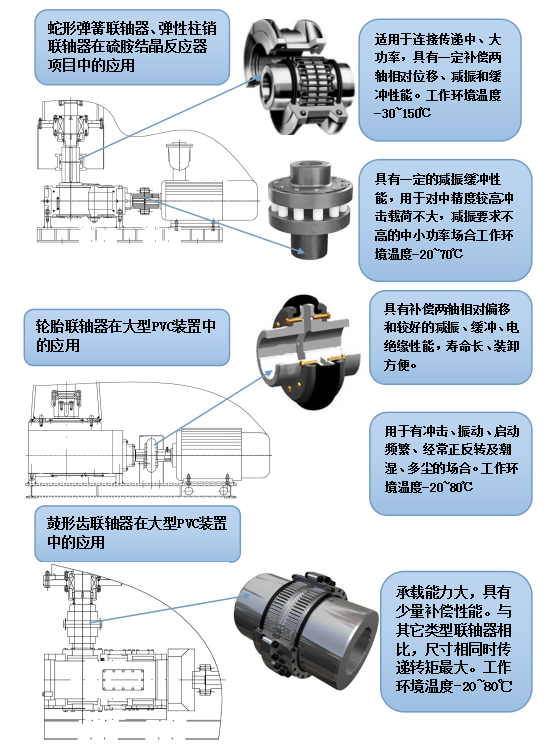 針對于蛇形彈簧聯軸器、彈性柱銷聯軸器、輪胎聯軸器、鼓形齒聯軸器在工程中的應用
